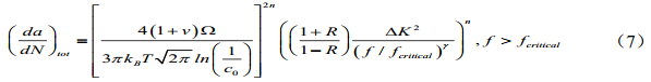 ,這一模型忽略了加載頻率等外界條件對(duì)于裂紋生長的影響[13]。疊加模型作為對(duì)Paris模型的補(bǔ)充,將加載頻率引入模型中,但是對(duì)加載頻率的作用未給出準(zhǔn)確量化,而且對(duì)于應(yīng)力腐蝕(SCC)和疲勞(fatigue)的關(guān)系也沒 有 明 確 的 解 答[ 1 4 , 1 5 ]。 聯(lián) 合 因 子 模 型 如 公 式