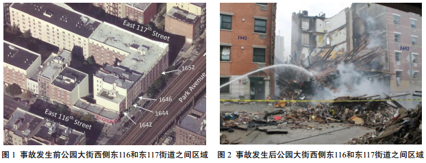 2014年3月12日上午9:30,美國某燃?xì)夤艿佬孤┍ㄖ饟p壞了兩棟毗鄰的五層大樓。這兩棟大樓坐落在公園大街(Park Avenue)西側(cè),位于紐約市曼哈頓東哈雷姆區(qū)東116號和東117號街區(qū)之間(圖 1、圖 2)。事故造成8人死亡,超過50人受傷, 100多戶家庭疏散。愛迪生公司(Con Edison)支付的設(shè)備損壞、應(yīng)急響應(yīng)、修復(fù)和管道替換的直接成本超過190萬美元。