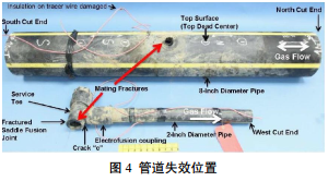 (2)紐約環(huán)保署2006年才對下水管道的缺口進(jìn)行修復(fù),在缺口修復(fù)以前地表水和土壤進(jìn)入下水管道,導(dǎo)致燃?xì)飧删失去支撐,管線下沉和熱熔接頭缺陷處的過載造成管道失效。