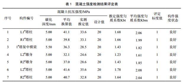 由混凝土強(qiáng)度檢測結(jié)果(表 1)可知,抽檢構(gòu)件強(qiáng)度均滿足規(guī)范及設(shè)計(jì)要求,評定標(biāo)度均為1,構(gòu)件強(qiáng)度狀態(tài)良好。