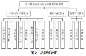 系統(tǒng)功能主要包括三維地理信息模塊、基礎(chǔ)功能模塊、系統(tǒng)管理模塊,實(shí)現(xiàn)三維場(chǎng)景操作、統(tǒng)計(jì)分析、地質(zhì)環(huán)境信息查詢統(tǒng)計(jì)等功能。見圖 2。