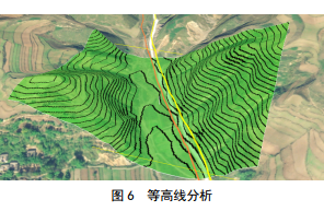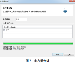 用戶通過(guò)在三維場(chǎng)景中畫多邊形的方式生成任意區(qū)域的等高線數(shù)據(jù),可以隨意調(diào)整等高距而得出不同的等高線圖,并可將系統(tǒng)分析得出的等高線圖以矢量數(shù)據(jù)的形式導(dǎo)出。土方量分析功能是用戶修改地形(挖方或者填方),系統(tǒng)自動(dòng)計(jì)算出挖方或者填方的體積。見圖 6、圖 7。