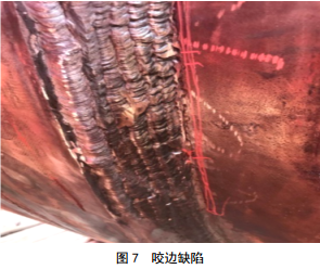 圖 7中焊縫外觀成型差,這與焊縫質量有直接關系,如焊工水平、是否按規(guī)程操作等。焊接電流過大或焊接速度過快易導致咬邊,圖 7劃線處,咬邊處極易產(chǎn)生焊趾裂紋。