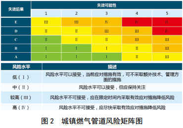 風(fēng)險(xiǎn)評(píng)估結(jié)果的準(zhǔn)確性和有效性取決于數(shù)據(jù)采集的完備程度, GB/T 27512―2011《埋地鋼質(zhì)管道風(fēng)險(xiǎn)評(píng)估方法》不適用于非金屬城鎮(zhèn)燃?xì)夤艿溃乙罁?jù)管道沿線人口密集程度、土壤腐蝕性、建筑物的密集程度和重要程度劃分管段也不盡合理。可將燃?xì)夤艿佬孤┑墓收蠘淠P团c事件樹模型結(jié)合開展定量評(píng)價(jià),通過最小割集計(jì)算得出導(dǎo)致管道泄漏的主要風(fēng)險(xiǎn)因素,利用三角模糊數(shù)表示燃?xì)夤艿佬孤┖蠊陌l(fā)生概率和后果的嚴(yán)重程度,采用專家評(píng)分法、模糊層次分析法、模糊綜合評(píng)價(jià)技術(shù)確定管道泄漏后果的風(fēng)險(xiǎn)等級(jí),以實(shí)現(xiàn)燃?xì)夤艿赖姆旨?jí)管理。最終建立風(fēng)險(xiǎn)矩陣圖(圖 2),實(shí)現(xiàn)動(dòng)態(tài)風(fēng)險(xiǎn)評(píng)估并指導(dǎo)檢驗(yàn)維修。
