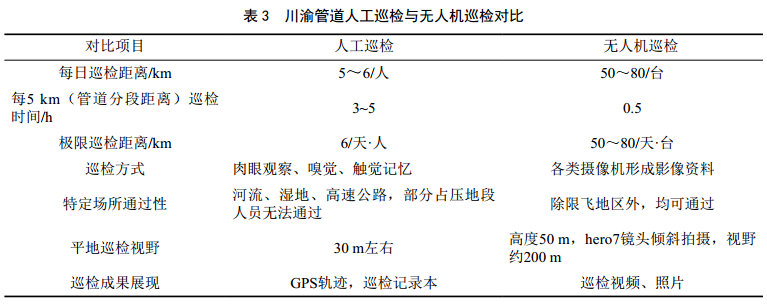(2)日常巡檢。將無人機管道巡檢作為主要巡檢方式,補充人工管道巡護,滿足“增加巡護頻次”“增加技防措施”等高后果區(qū)管控要求。無人機巡檢與人工巡檢管理模式優(yōu)劣對比見表 3。