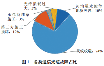 管道通信光纜與管道同溝鋪設,埋深一般在地表面下 1.0~1.5 m。通信光纜故障可分為光纜中斷、光纜斷芯和損耗過大[1]。光纜中斷故障一般是外載荷作用力導致,地表特征明顯,易于發(fā)現(xiàn)。光纜斷芯或光纖損耗過大等常見故障地表沒有明顯特征,故障點的查找和定位比較困難。如圖 1所示,某管道公司近3年累計發(fā)生通信光纜故障56起,其中因鼠蟻咬噬導致光纜斷芯及光纖損耗過大等光纜故障占比達79%。