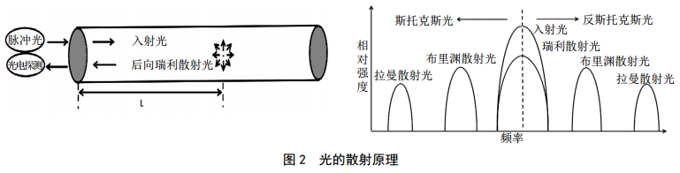 光時域反射儀(Optical Time Domain Reflectometer, OTDR)是當前通信光纜維護最常用、最便捷的工具。它是基于光在光纖中傳輸過程中的后向瑞利散射和菲涅爾反射原理。如圖 2所示。激光器發(fā)出的光在光纖傳播過程中,受光纖材質(zhì)不均勻性影響,光子與纖芯晶格間發(fā)生碰撞會產(chǎn)生散射效應。包括瑞利散射、拉曼散射、布里淵散射。當光纖鏈路中有非常規(guī)能量損失點時,后向瑞利散射光特性會發(fā)生明顯變化,通過檢測后向散射光能量的大小用以定位傳輸衰減故障點。當光纖鏈路中有斷點時,光會在斷點處產(chǎn)生菲涅爾反射,通過檢測光信號即可定位光纖斷點位置。