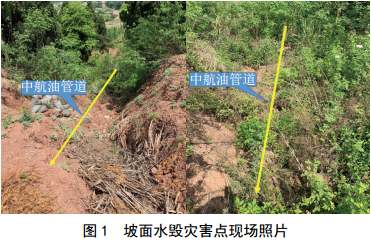 (1)水毀災(zāi)害。地 質(zhì) 災(zāi) 害 主 要 以 坡 面 和 河(溝)道水毀為主(圖 1)。需要調(diào)閱和調(diào)查當(dāng)?shù)厮馁Y料(暴雨頻率等)、災(zāi)害點(diǎn)地形地貌(坡長(zhǎng)等)、管敷情況(埋深等)等 。
