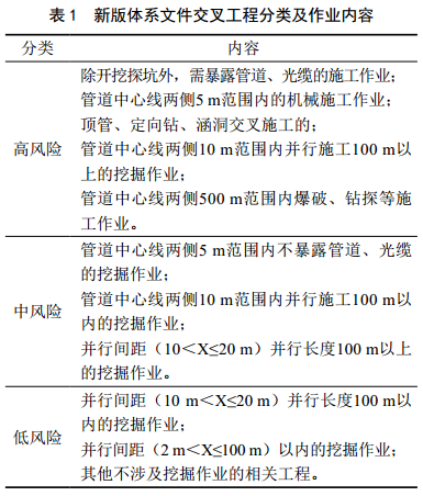 核心是落實(shí)“四防措施”,即人防、物防、技防和信息防相結(jié)合,構(gòu)建管道安全保護(hù)防護(hù)體系,提升主動(dòng)感知預(yù)防風(fēng)險(xiǎn)能力。陜京管道按照公司新版體系文件對(duì)交叉工程施工風(fēng)險(xiǎn)類型重新分類 ,由大型、中型、小型交叉工程管理,改為高風(fēng)險(xiǎn)、中風(fēng)險(xiǎn)、低風(fēng)險(xiǎn)交叉工程進(jìn)行管控(表 1)。新修訂的管控措施更為科學(xué)、合理和適用。高、中、低風(fēng)險(xiǎn)的交叉工程分別實(shí)行一、二、三級(jí)布控,同時(shí)根據(jù)現(xiàn)場(chǎng)風(fēng)險(xiǎn)采取人防、物防、技防等措施;對(duì)中、高風(fēng)險(xiǎn)交叉工程或周邊工程建立施工動(dòng)態(tài)微信群,及時(shí)獲取施工信息,落實(shí)信息防。