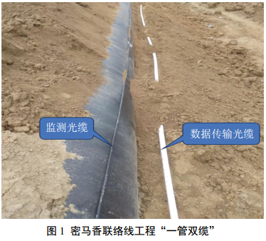 為此,密馬香聯(lián)絡線工程設計時增加敷設一條技防設備專用光纜,即與管道底部平齊敷設一個24芯管道光纜作為數(shù)據(jù)傳輸光纜;同時,在管道氣流前進方向右上方45°管道外壁處用攔卡固定一根16芯鎧裝監(jiān)測光纜(圖 1),為運行期間實施光纖振動預警、泄漏監(jiān)測、應力應變監(jiān)測等技防措施預留了分布式傳感器。