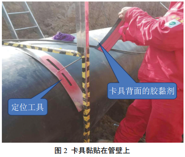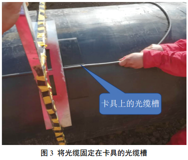 1. 光纜的固定。工程初步設計文件將監(jiān)測光纜用膠帶固定在管壁上。由于鎧裝光纜自重較大,管道防腐層表面光滑,膠帶與防腐層黏結力不足,難以固定在管壁上。經(jīng)反復試驗,在管壁上間隔6 m設置一個聚乙烯材料卡具,通過膠黏劑將卡具固定在管壁上,光纜置于卡具槽內。