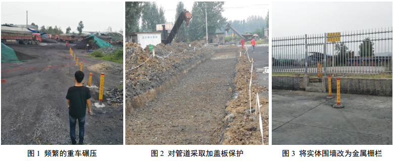 博愛縣境內有大量煤炭物流園,管道在鋪設期間穿越了沁陽西萬、博愛等煤場共計23家,大量堆積的煤炭在管道投產(chǎn)后形成活動性占壓,并造成了圈占等圍墻占壓隱患。同時穿越的煤場管段也是高后果區(qū)段,煤炭運輸車輛每天進出頻繁,在管道上方反復碾壓,直接危及管道安全(圖 1)。博愛站和上級部門將上述問題以重大安全隱患多次上報至省市縣三級政府主管部門,管道月報及時反映煤炭占壓、管道安全距離不足等隱患情況。同時與地方政府有關部門建立管道保護微信群,第一時間發(fā)布信息,加強工作交流。
