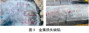 馬仙輸氣管道在終點南八仙聯(lián)合站設陰極保護間1座,內(nèi)置陰極保護設備,配置2路輸出恒電位儀機柜1臺。恒電位儀運行穩(wěn)定。管道自投運以來未檢測過外防腐層整體質(zhì)量; 2014年9月內(nèi)檢測開挖驗證14個探坑,其中12個探坑外防腐層良好, 2個探坑外防腐層出現(xiàn)破損且已修復完好。管道外腐蝕失效可能性分值0.0 578~0.2 489,評價結(jié)果如圖4所示,藍色折線代表外腐蝕指標導致的失效可能性。金屬損失缺陷如圖 5所示。