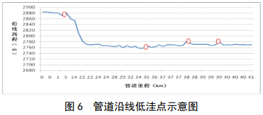 管 道 沿 線 地 形 東 高 西 低 , 地 表 高 程2 752.0~2 883.2 m,相對高差131.2 m,如圖 6所示。天然氣中的水分因密度較大會在管道低洼處聚集,容易形成腐蝕敏感區(qū)。