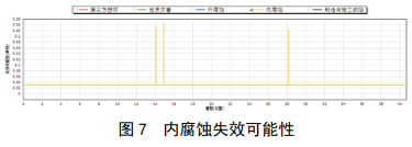 由圖 6可知,管道存在高程低洼點: 4.379 km、28.938 km、 37.388 km、 39.224 km等處,水分聚集可能形成腐蝕敏感區(qū)。 2014年11月第二次清管化驗結(jié)果顯示天然氣中并未含水, 2016年4月第五次清管雜質(zhì)中含水,應該考慮管道低洼點水分聚集形成腐蝕敏感區(qū)。管道內(nèi)腐蝕失效可能性分值為0.0 309~0.2 497,評價結(jié)果如圖 7所示,黃色折線代表內(nèi)腐蝕指標導致的失效可能性。