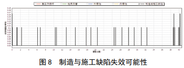 管 道 制 造 與 施 工 缺 陷 指 標 分 值 為0.0 206~0.1 651,評價結(jié)果如圖 8所示,黑色折線代表制造與施工缺陷導致的失效可能性。