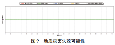 馬仙輸氣管道地處荒漠戈壁,四周地勢平坦,無山體、河流、冰川等,常年多風少雨,基本無地質(zhì)災害發(fā)生可能。管道全程地質(zhì)災害失效可能性分值0.01,評價結(jié)果如圖 9所示,綠色折線代表地質(zhì)災害導致的失效可能性。