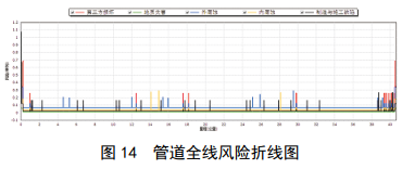 馬仙輸氣管道風險值0.1 666~1.8 857,圖 14反映了管道全線風險值隨里程變化規(guī)律,風險值越大表 示管道風險越大,風險值較高管段見表1。