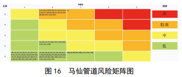 圖 15是馬仙管道整體風險餅狀統(tǒng)計圖,風險等級分為高、較高、中、低四個等級。評價結(jié)果顯示,按管道長度計較高風險管段占比0.98%,低風險管段占比99.02%。風險矩陣如圖 16所示。