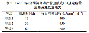Enbridge公司6B管線破裂泄漏后,最先做出反應(yīng)的是當(dāng)?shù)毓艿谰S護(hù)站的4名Enbridge雇員。他們沿著Talmadge溪下游而不是開裂點(diǎn)周邊區(qū)域做了補(bǔ)救工作,忘記了利用Talmadge溪邊的涵洞做底流壩來減少原油擴(kuò)散,對于流速很快的河水反而使用了不合適的圍油欄。漏油處理承包商直到10多個(gè)小時(shí)后才確定漏油點(diǎn)。由于缺乏明確的應(yīng)急資源要求, Enbridge公司自己詮釋了處理開裂所需資源的量級,導(dǎo)致發(fā)現(xiàn)開裂后最初幾小時(shí)內(nèi)缺少足夠的資源和漏油處理回收設(shè)備。相比之下,海岸警衛(wèi)隊(duì)和EPA法規(guī)都明確要求應(yīng)急預(yù)案中滿足最糟情況的泄漏應(yīng)急所需物資,且必須安置在能夠在應(yīng)急預(yù)案所特定的時(shí)間內(nèi)到達(dá)現(xiàn)場的位置。表1 為Enbridge公司應(yīng)急資源處置能力。