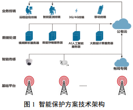 依托管道周邊的鐵塔基建資源,采用現(xiàn)代化監(jiān)控傳感器,利用人工智能技術(shù)對管道周邊出現(xiàn)的各種車輛、行人等和偷盜原油、建筑施工場景的相關(guān)因素進行解析,同時接入大數(shù)據(jù)算法對人工智能解析之后數(shù)據(jù)進行實時分析,對危害管道高后果區(qū)安全的各種場景進行智能監(jiān)測,保護方案技術(shù)架構(gòu)如圖 1所示。