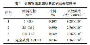 失效頻率的確定普遍采用同類設(shè)備的歷史統(tǒng)計數(shù)據(jù),經(jīng)數(shù)據(jù)來源及可靠性分析后,應(yīng)用相關(guān)理論模型進行事故發(fā)生概率計算,然后結(jié)合項目實際情況進行修正采用。國外可供查閱的設(shè)備失效數(shù)據(jù)庫較多,而國內(nèi)在這方面的數(shù)據(jù)積累相對較少。天然氣輸送管道的基礎(chǔ)失效頻率來自GB 32167―2015《油氣輸送管道完整性管理規(guī)范》附錄G推薦的輸氣管道泄漏頻率,其頻率為4×10﹣4次/(km·a)。管道的泄漏場景由SY/T 6714―2008《基于風險檢驗的基礎(chǔ)方法》和SY/T 6859―2012《油氣輸送管道風險評價導(dǎo)則》定義,管道的泄漏場景選取如表 1所示。