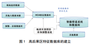 為了建立完整的高后果區(qū)特征數(shù)據(jù)庫,需要綜合各系統(tǒng)和數(shù)據(jù)庫資源。以智能管道系統(tǒng)和數(shù)據(jù)庫作為基礎(chǔ),包括管道的基礎(chǔ)數(shù)據(jù)如:管材、焊接工藝、管徑壁厚、輸送介質(zhì)、埋深鋪管等;管道的運營數(shù)據(jù)如:工作壓力、溫度變化、清管泄壓、內(nèi)外檢測數(shù)據(jù)等;管道的評價數(shù)據(jù):腐蝕缺陷、剩余強度檢測、維修檢測、風(fēng)險評價等[11]。還包括地質(zhì)災(zāi)害圖形庫和預(yù)警系統(tǒng)數(shù)據(jù),現(xiàn)場監(jiān)控的實時更新數(shù)據(jù),預(yù)警、決策數(shù)據(jù)庫的評價預(yù)測數(shù)據(jù),以及其他相關(guān)的大數(shù)據(jù)來源。特征數(shù)據(jù)庫建立如圖 1所示。