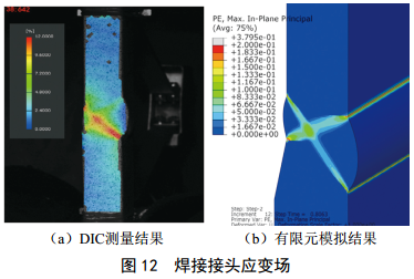 取焊接接頭板狀拉伸試樣進行測試,焊縫位于試樣中部,試樣內外表面保持焊縫原有狀態(tài),試樣側面精磨并噴漆,以制造表面特征便于計算機處理(圖 11)。試驗過程用雙目相機對試樣側面成像并計算應變,結果見圖 12(a)。可見,低強匹配焊縫接頭拉伸時應變分布不均勻,在焊縫內部高應變區(qū)呈X形分布, X形的四個點為內外壁焊趾,高應變區(qū)與主應力方向近似成45度,此分布特征也可以利用有限元計算得出(圖 12(b))。 X形的變形集中帶表明管線的變形將主要集中在焊縫區(qū)內。低強匹配的焊縫將影響高鋼級管道的抗變形能力。