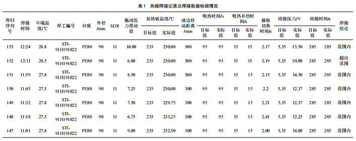 熱熔焊接數(shù)據(jù)通過接口傳到TMS系統(tǒng)后,系統(tǒng)首先對焊接數(shù)據(jù)進行解碼,同時自動根據(jù)上述公式對Pg進行判斷,如超過目標范圍,則系統(tǒng)提示焊接結(jié)果超出范圍。此外,系統(tǒng)還將焊口號、加熱板溫度、抽板切換時間、加熱時間、冷卻時間等參數(shù)數(shù)字化并在系統(tǒng)中永久保存,以便追溯。如某公司上傳至TMS系統(tǒng)的焊接數(shù)據(jù),系統(tǒng)校驗發(fā)現(xiàn)界面凈作用力Pg超出范圍,據(jù)此判定該臺熱熔焊機可能存在質(zhì)量問題,要求對熔接壓力超標的焊口做進一步的外觀檢查,必要時做破壞性試驗,并要求使用者及時聯(lián)系焊機供應商進行檢修。表 1為某公司熱熔焊接記錄及焊接數(shù)據(jù)檢閱情況。