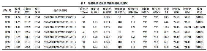 TMS系統(tǒng)中電熔焊接數(shù)據(jù)是以某管件實際焊接能量值與管件供應商提供的標準能量范圍相比較進行校驗,要求管件供應商通過大量試驗及結(jié)合設計方案確定該管件焊接能量范圍,同時系統(tǒng)記錄焊口號、焊接電壓、焊接時間、電阻值等其他焊接參數(shù)數(shù)字化數(shù)據(jù)并在系統(tǒng)中永久保存,以便追溯。對于能量超范圍 的焊口要求施工方、監(jiān)理方著重進行外觀檢查,必要 時進行破壞性試驗,同時也對管件供應商供貨的一致性、焊機性能的穩(wěn)定性進行了復核和校驗。表 2為電熔焊接記錄及焊接數(shù)據(jù)檢閱情況。