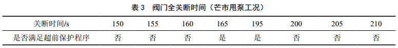 基于初設的超前保護原理模擬所有故障,包括甩泵、進出站ESD閥門故障關斷、監(jiān)控閥室故障關斷。依次更改閥門全關斷時間,得出滿足所有故障超前保護程序的閥門全關斷時間范圍。表 3為芒市甩泵工況下的閥門全關斷時間范圍。