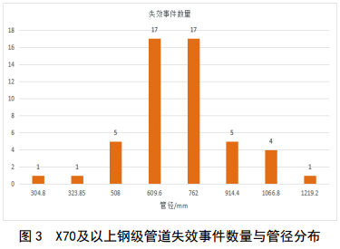 管道失效事件主要發(fā)生在609 mm (1 7 起 ,33.3%)和762 mm(17起, 33.3%)管徑的管道,X70及以上鋼級大口徑管線(>508 mm)失效事件數(shù)量約為小口徑(≤508 mm)管線的6倍(圖 3)。
