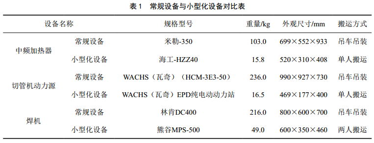 在保證搶修機(jī)具設(shè)備功能正常、滿足作業(yè)要求的前提下,將其小型化、輕量化、便捷化,替代原常規(guī)設(shè)備,可高效快捷完成裝車和山區(qū)進(jìn)場(chǎng),以確保在有限時(shí)間內(nèi)完成搶修作業(yè)。常規(guī)設(shè)備與小型化設(shè)備對(duì)比見表 1。選型之初即已滿足小型化要求的設(shè)備見表 2。