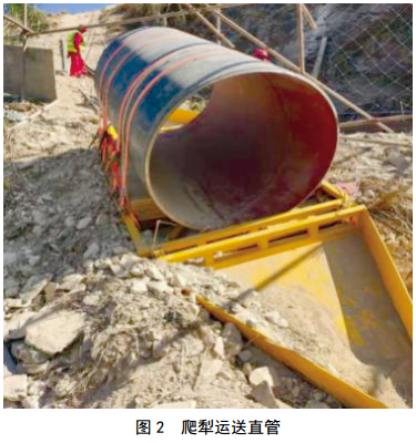 大于35°的石質(zhì)山坡無法用挖掘機(jī)運(yùn)管進(jìn)場(chǎng),高空索道雖能適應(yīng)較大坡度,但需要具備索道安裝資質(zhì)人員架設(shè),預(yù)先安裝地錨,并提前儲(chǔ)備索道架設(shè)所需物資,應(yīng)用條件受限。因此,可采取爬犁運(yùn)輸系統(tǒng)運(yùn)管(圖 2)。管道施工中一般在山頂焊接管道,然后從坡頂依次沿山坡放管,搶修時(shí)可從山后找到進(jìn)場(chǎng)便道,只需簡(jiǎn)單修筑便可到達(dá)山頂。