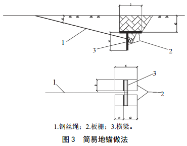 (3)地錨鋪設(shè)。地錨是固定卷揚(yáng)機(jī)及滑輪的關(guān)鍵裝置,根據(jù)地錨安裝土質(zhì),可分別選用巖質(zhì)地錨鋪 設(shè)方式和土質(zhì)地錨鋪設(shè)方式。