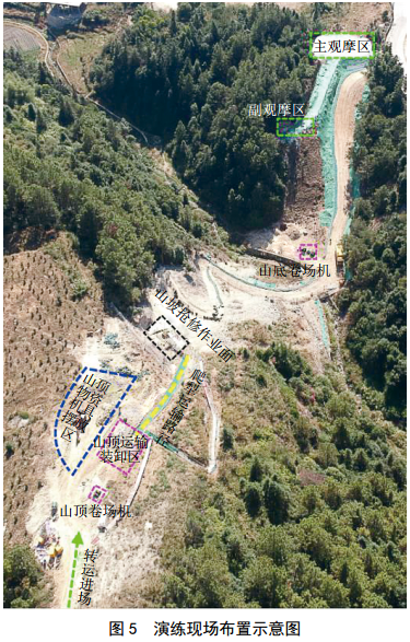 西氣東輸管道公司于2019年11月開展了山區(qū)管道泄漏突發(fā)事件實(shí)戰(zhàn)演練。模擬西氣東輸三線干線福建段在泉州市洛江區(qū)虹山鄉(xiāng)蘇山村發(fā)生天然氣管道泄漏,泄漏點(diǎn)位于35°(局部達(dá)40°)以上坡度的石質(zhì)山坡,無預(yù)設(shè)地錨等任何輔助措施,在山坡中部設(shè)置了模擬作業(yè)坑,在山頂、山底設(shè)置地錨、卷揚(yáng)機(jī),所有搶修設(shè)備、管道短節(jié)等通過小路運(yùn)送至山頂,現(xiàn)場(chǎng)布置情況見圖 5。本次演練檢驗(yàn)了從設(shè)備到達(dá)山頂?shù)胶附咏Y(jié)束的整個(gè)作業(yè)過程,用時(shí)45小時(shí),無損檢測(cè)結(jié)果合格,充分驗(yàn)證了運(yùn)輸系統(tǒng)的適用性。此進(jìn)場(chǎng)方式快捷有效,能夠保證在72小時(shí)內(nèi)完成山區(qū)管道搶修作業(yè)。