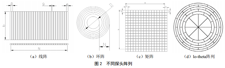 通常將一個(gè)大尺寸的探頭按規(guī)則分割成許多獨(dú)立小單元探頭的陣列,分為平面陣列和非平面陣列,其中平面陣列又細(xì)分為一維陣列(線陣和環(huán)陣)和二維陣列(矩陣和lo-theta陣列),如圖 2所示;非平面陣列主要是指柱面陣列[3]。