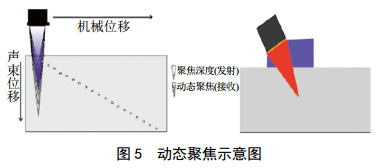 超聲相控陣檢測(cè)技術(shù)一般通過(guò)控制參與波束形成的發(fā)射和接收探頭陣列單元以及對(duì)應(yīng)每個(gè)單元的發(fā)射器和接收器的時(shí)間延遲規(guī)則和激勵(lì)電壓幅度來(lái)形成自己的聚焦法則[3]。目前主要采用動(dòng)態(tài)聚焦,如圖 5所示,超聲聲束沿聲束軸線,在發(fā)射時(shí)使用單個(gè)聚焦脈沖,在接收時(shí)通過(guò)計(jì)算對(duì)所有深度進(jìn)行編程深度聚焦,實(shí)現(xiàn)對(duì)不同深度進(jìn)行聚焦掃描。最新技術(shù)是實(shí)時(shí)全聚焦(TFM)成像檢測(cè), TFM是一個(gè)信號(hào)處理算法,利用全矩陣采集TFM的數(shù)據(jù)來(lái)對(duì)缺陷的位置及外形尺寸進(jìn)行精確成像。