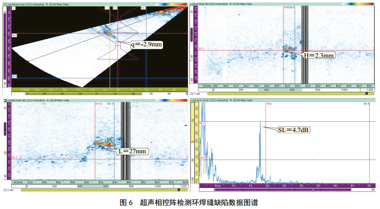 實(shí)際應(yīng)用中,超聲相控陣檢測(cè)的工藝設(shè)置、全程掃查記錄等信息,將以多種形式呈現(xiàn)在屏幕上,顯示出各種缺陷供測(cè)量、分析。一般設(shè)置雙通道來(lái)采集數(shù)據(jù), 結(jié)合S掃描、 B掃描及A型顯示,對(duì)缺陷的位置、深度、長(zhǎng)度進(jìn)行測(cè)量。圖 6所示為某環(huán)焊縫相控陣檢測(cè)缺陷數(shù)據(jù)圖譜,相比射線檢測(cè)和常規(guī)超聲檢測(cè),數(shù)據(jù)顯示更加直觀明了,便于存儲(chǔ)和讀取。