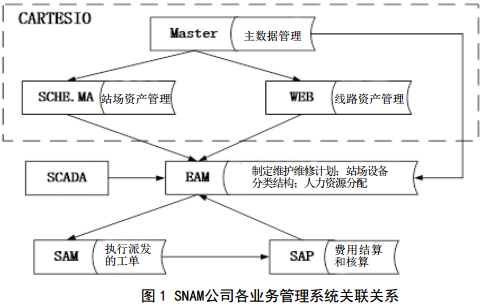 意 大 利 S N A M 公 司 的 信 息 化 工 作比較成熟,基于開放的GIS系統(tǒng)開發(fā)的CARTESIO(管道資產(chǎn)管理)系統(tǒng),實現(xiàn)了對管網(wǎng)主數(shù)據(jù)、線路資產(chǎn)數(shù)據(jù)和站場資產(chǎn)數(shù)據(jù)的統(tǒng)一標(biāo)準(zhǔn)化管理, CARTESIO系統(tǒng)數(shù)據(jù)引入EAM(資產(chǎn)管理)系統(tǒng),由EAM系統(tǒng)中建立的模型和人力資源管理信息生成作業(yè)工單傳遞給執(zhí)行層的SAM(工單管理)系統(tǒng),再將完成工作后的數(shù)據(jù)反饋給EAM系統(tǒng),同時傳遞給SAP(財務(wù)核算)系統(tǒng)進(jìn)行工單結(jié)算和核算, SAP系統(tǒng)的結(jié)果數(shù)據(jù)也反饋給EAM系統(tǒng),最終實現(xiàn)資產(chǎn)維護(hù)與企業(yè)財務(wù)核算的閉環(huán)管理。同時, EAM系統(tǒng)在接收反饋信息后,通過對維護(hù)事件的學(xué)習(xí)來優(yōu)化資產(chǎn)的維修維護(hù)模式,從而實現(xiàn)各個系統(tǒng)之間相互關(guān)聯(lián)和支持。如圖 1所示。如在實物資產(chǎn)管理中,通過Master(主數(shù)據(jù)管理)對 線路和站場主數(shù)據(jù)進(jìn)行統(tǒng)一管理,并與線路、站場和設(shè)備管理實現(xiàn)數(shù)據(jù)的交互與共享,同時也確保了關(guān)鍵核心數(shù)據(jù)的完整性和準(zhǔn)確性。各系統(tǒng)的管理和應(yīng)用均由專業(yè)技術(shù)部門負(fù)責(zé),軟件人員僅僅提供軟件使用故障的解決方案,不涉及任何業(yè)務(wù)管理。