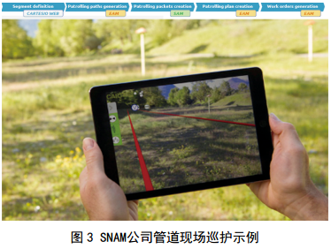 SNAM公司探測管道異常和干擾的主要方法為現(xiàn)場巡護(hù)和空中巡查(采用直升機(jī)),通過多個系統(tǒng)相互協(xié)作完成巡護(hù)管理工作。其中CARTESIO WEB系統(tǒng)主要管理管道基礎(chǔ)數(shù)據(jù)信息,如將管道的屬性數(shù)據(jù)和地理位置信息與GIS地圖關(guān)聯(lián),根據(jù)管道穿越公路、鐵路、河流等特征位置將管道動態(tài)分段,更便于在GIS系統(tǒng)中管理管道屬性信息。管道巡護(hù)管理分為五步:第一步,在CARTESIO WEB系統(tǒng)中對管段進(jìn)行定義(確定需要巡護(hù)的管道);第二步,在EAM系統(tǒng)中生成巡護(hù)路徑;第三步,在SAM系統(tǒng)中創(chuàng)建巡護(hù)工作包;第四步,根據(jù)工作包在EAM系統(tǒng)中創(chuàng)建巡護(hù)計劃;第五步,在EAM系統(tǒng)中生成巡護(hù)任務(wù)。現(xiàn)場巡護(hù)員根據(jù)巡護(hù)任務(wù)通過手持終端完成巡護(hù)工作(圖 3)。