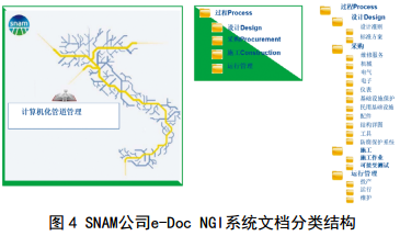 SNAM公司開發(fā)了e-Doc NGI文件管理系統(tǒng)用來管理上百萬個標(biāo)準(zhǔn)和規(guī)則,涉及到站場的每一個工藝流程圖、設(shè)備結(jié)構(gòu)圖、標(biāo)準(zhǔn)規(guī)范文本等信息。該系統(tǒng)相當(dāng)于一個完整的大型運營管理知識庫,按資產(chǎn)的設(shè)計、采購、施工、運行管理四個階段劃分知識體系。設(shè)計階段主要包含設(shè)計技術(shù)標(biāo)準(zhǔn)、指南;采購階段包含實現(xiàn)和管理資產(chǎn)所必需的采購技術(shù)標(biāo)準(zhǔn)文件,如機(jī)械、電氣、儀表部件和陰極保護(hù)設(shè)備等;施工階段包含有關(guān)資產(chǎn)實現(xiàn)的標(biāo)準(zhǔn)和驗收測試的技術(shù)標(biāo)準(zhǔn)文件;運行管理階段包含設(shè)備設(shè)施和測量設(shè)備調(diào)試、維護(hù)、運行和退役全過程的技術(shù)標(biāo)準(zhǔn)文件。