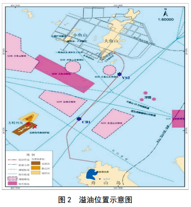 本海底管道工程跨越長白西航道和規(guī)劃的大魚山10萬噸級航道,五峙山北錨地和大魚山東南錨地距離管道路由較近,船舶拋錨時會危及路由安全[2]。經(jīng)分析,設(shè)置兩個管道溢油點,分別位于管道與長白西航道的交界點(CB1)、大魚山10萬噸級航道(YS2),溢油位置見圖 2。管道管徑813 mm、運行壓力0.98 MPa、輸送原油密度按0.88 g/cm3計。保守按輸油管道被鐵錨破壞、單管斷裂,泄漏速度為0.74 m3/s,發(fā)生泄漏時間按1 h計,泄漏量約2 664 m3。考察風(fēng)向、風(fēng)速、原油泄漏后時間長短對溢油范圍的影響。