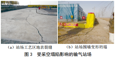 采空塌陷范圍內(nèi)地表被拉裂,形成拉張裂縫,同時(shí)由于差異性沉降,地面形成錯(cuò)臺(tái)。位于塌陷區(qū)輸氣 站場多形成裂縫,工藝管道受不同方向作用力而發(fā)生應(yīng)力集中,影響運(yùn)行安全;輸氣站場內(nèi)的建筑物、圍墻等受拉力、剪切力的作用,墻體出現(xiàn)裂縫甚至坍塌(圖 3)。