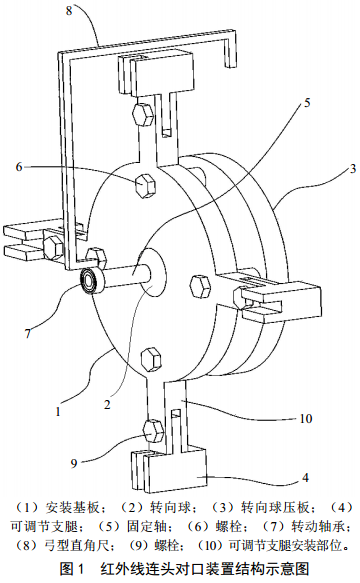 紅外線連頭對(duì)口裝置由安裝基板、轉(zhuǎn)向球、轉(zhuǎn)向球壓板和可調(diào)節(jié)支腿組成(圖 1)。四個(gè)可調(diào)節(jié)支腿等間距裝在圓形安裝基板四周。安裝基板與轉(zhuǎn)向球壓板之間設(shè)置有小孔,轉(zhuǎn)向球安裝在兩者之間,用螺栓連接。固定軸一端放置紅外線發(fā)射或接收器,另一端連接轉(zhuǎn)向球。固定軸內(nèi)部安裝轉(zhuǎn)動(dòng)軸以使得其上連接的弓型直角尺可以通過(guò)旋轉(zhuǎn)劃線。
