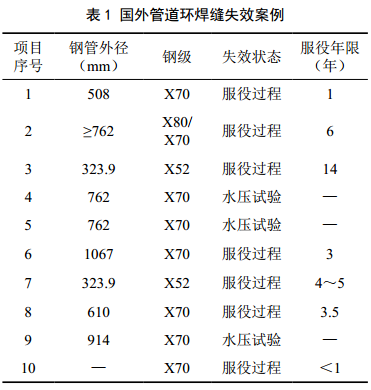 根據(jù)不完全統(tǒng)計(jì),北美地區(qū)在過去2~3年內(nèi)發(fā)生10次管道失效事故、多數(shù)為X70鋼級管道環(huán)焊縫失效,詳見表 1。