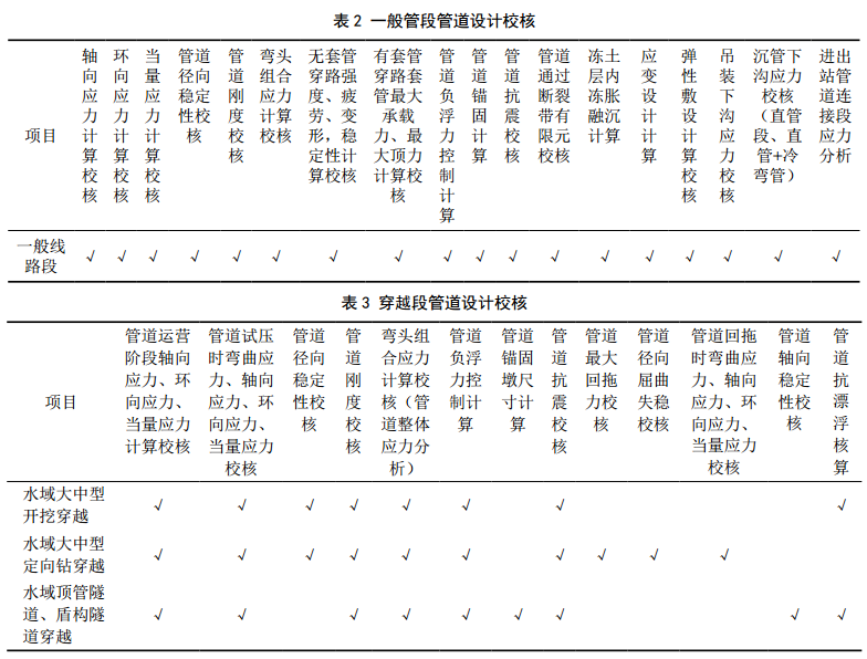 (2)提升應(yīng)力校核水平。在初步設(shè)計(jì)和施工圖設(shè)計(jì)階段,開展不同管段應(yīng)力校核,結(jié)合施工圖敷設(shè)情況,篩選典型地段,考慮管道可能經(jīng)受的外部荷載情況,采用有限元軟件進(jìn)行實(shí)際工況下的應(yīng)力校核,確保管道應(yīng)力不超過規(guī)范許用應(yīng)力,如表 2、表 3所示。