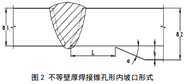 (4)改進(jìn)不等壁厚坡口設(shè)計(jì)。變壁厚處坡口焊接質(zhì)量差,易出現(xiàn)焊縫缺欠/缺陷和產(chǎn)生較大應(yīng)力集中,當(dāng)管道受到外部載荷作用時(shí),將一定程度擴(kuò)大載荷應(yīng)力。以中俄東線為例,對于常規(guī)內(nèi)部打磨斜坡的不等壁厚坡口,應(yīng)力集中系數(shù)在1.16~1.29之間。為減少應(yīng)力集中,優(yōu)化焊縫成型質(zhì)量,結(jié)合應(yīng)力計(jì)算結(jié)果,設(shè)計(jì)人員提出錐孔形坡口設(shè)計(jì),即在厚壁管內(nèi)部加工錐孔形坡口以實(shí)現(xiàn)等壁厚對接的目的,詳見圖 2。采用該圖形式的坡口,不同壁厚組合計(jì)算得到的應(yīng)力集中系數(shù)在1.04~1.08之間。