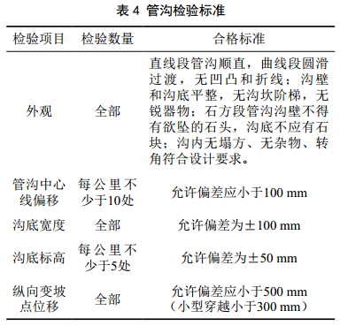 (6)連頭口位置及驗(yàn)溝要求。明確提出連頭口應(yīng)選擇在直管段上,距離彎管的曲線段不應(yīng)小于24 m,同時(shí)避免連頭口設(shè)在不等壁厚焊縫處,以降低組對時(shí)應(yīng)力集中。管溝成型后應(yīng)進(jìn)行檢查,管溝檢驗(yàn)項(xiàng)目、數(shù)量、方法及合格標(biāo)準(zhǔn)見表 4。