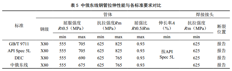 (2)縮小鋼管強(qiáng)度范圍。管材性能指標(biāo)在已有設(shè)計(jì)及管材標(biāo)準(zhǔn)中均有規(guī)定。中俄東線對X80管線鋼屈服強(qiáng)度上限由705 MPa降為675 MPa,抗拉強(qiáng)度上限由825 MPa降為765 MPa,為管材與焊材強(qiáng)度匹配奠定了基礎(chǔ)(表 5)。
